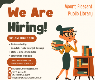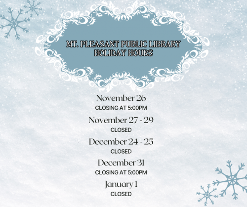 Welcome to the Mount Pleasant Public Library. The library is your one stop source for all of your informational needs. We have a large selection of books, magazines, newspapers, and electronic resources available to be checked out by our library card holders. Here you will also find electronic resources, news, announcements, and a calendar of upcoming library events!